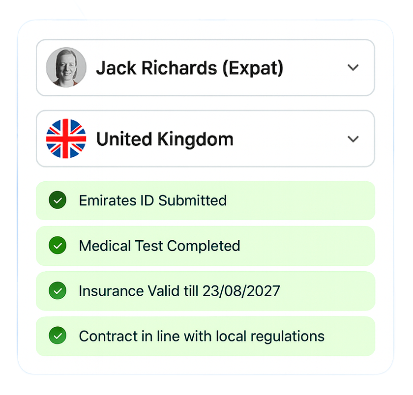From visa renewals and contract management to payroll and expense tracking for year-end accounting, to our compliance tools to keep your business fully aligned with UAE labour and tax laws — automatically.